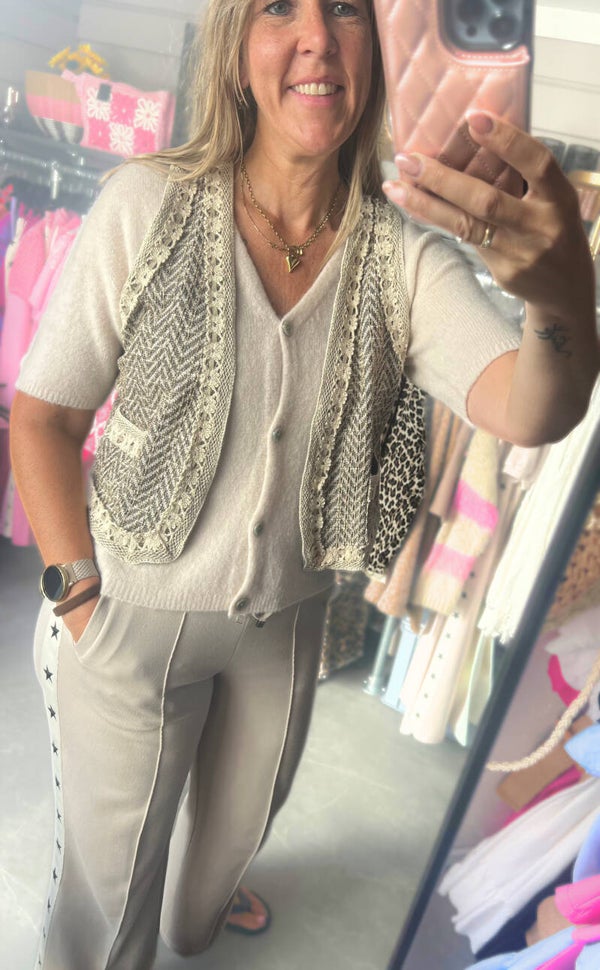 Het vestje heeft een v-hals, korte mouwen en in een mooie lichte kleur die echt overal bij gedragen kan worden.