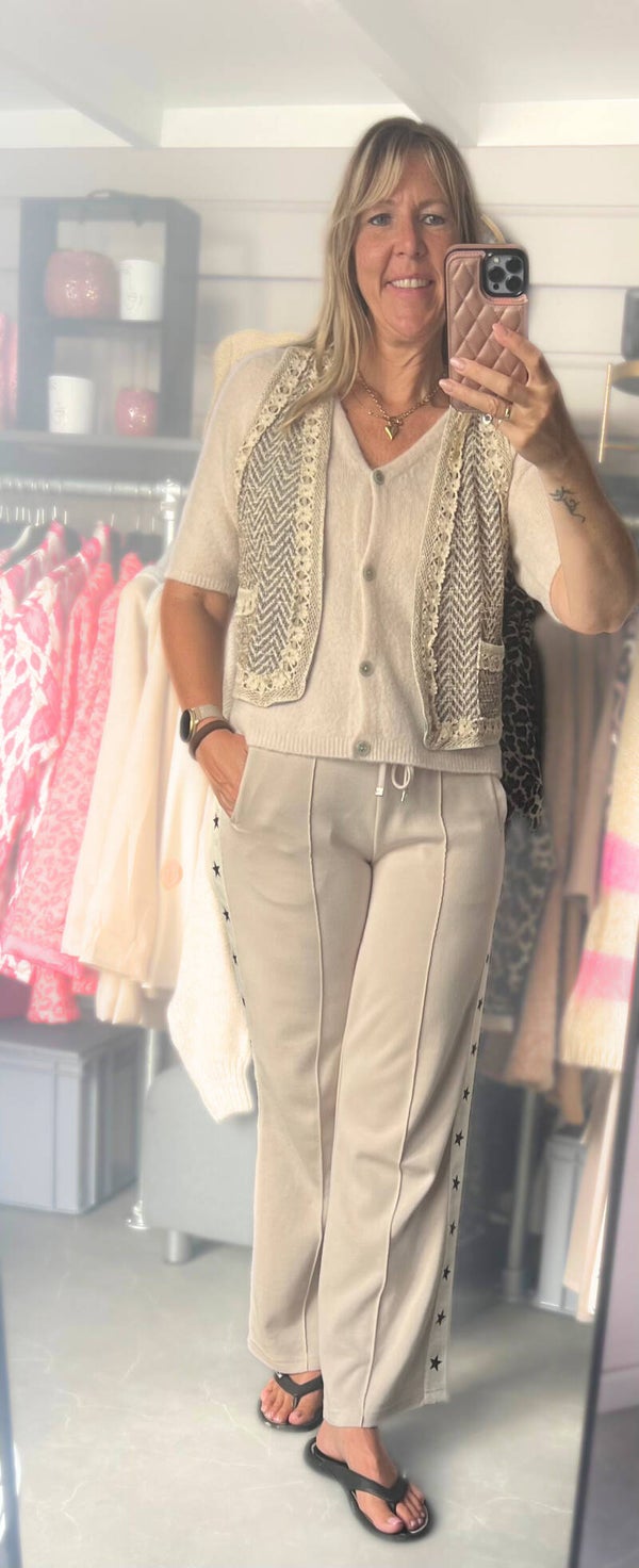Dit leuke giletje is gemaakt van een leuk stofje en een subltiele gouden glittertje.