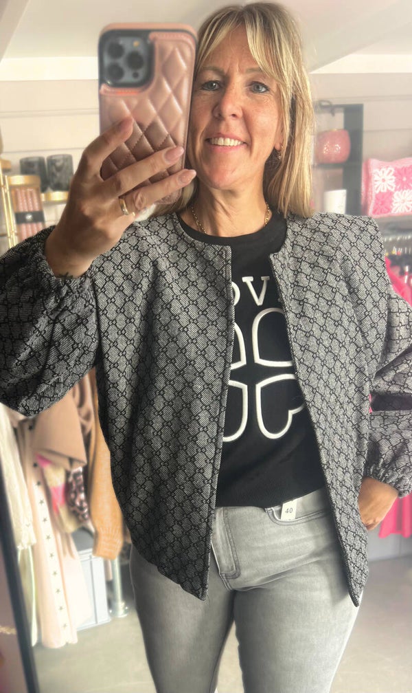 Het jasje heeft een bomberlook maar is openvallend. Heeft lange mouwen, twee zakken en leuk detail op de schouders.. Dit jasje is verfraaid met een all-over klassiek moderne print. Draagt comfortabel dankzij de zachte stof.