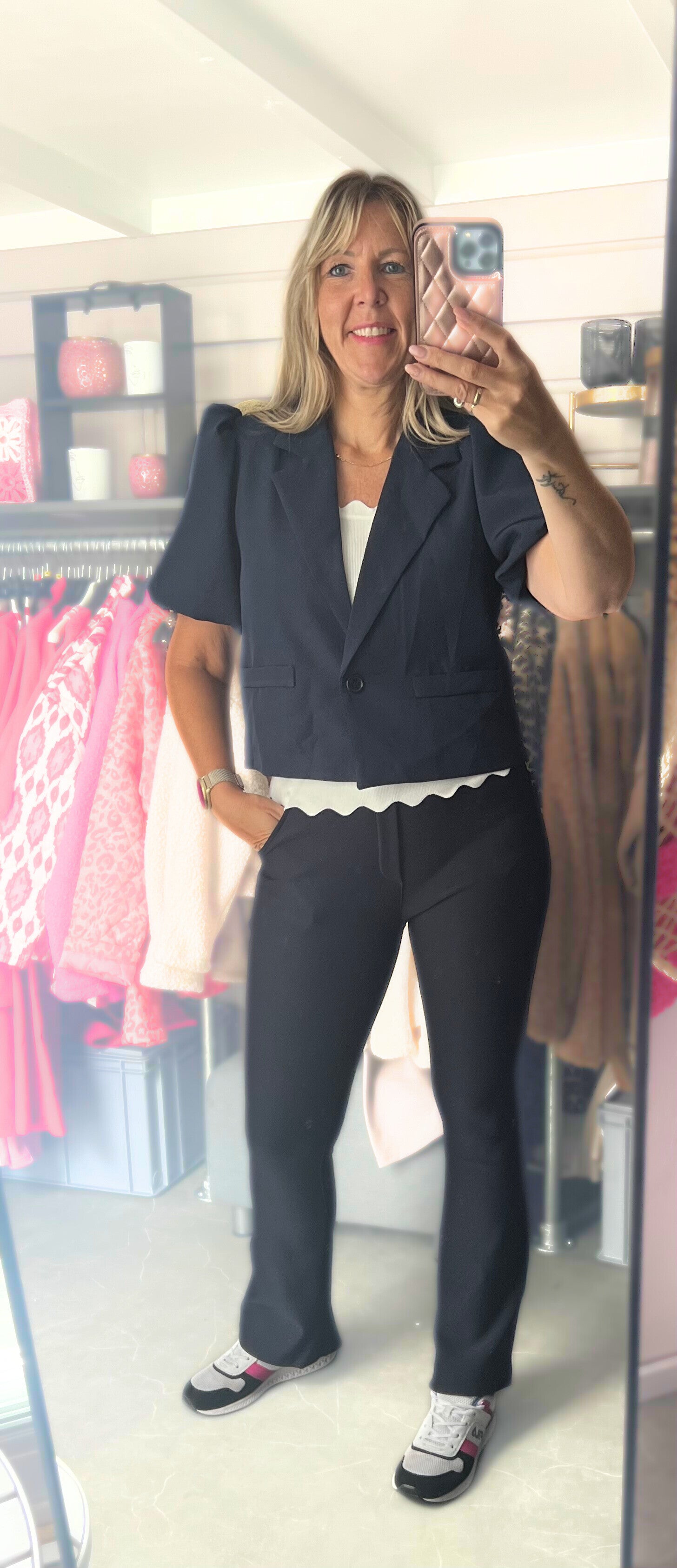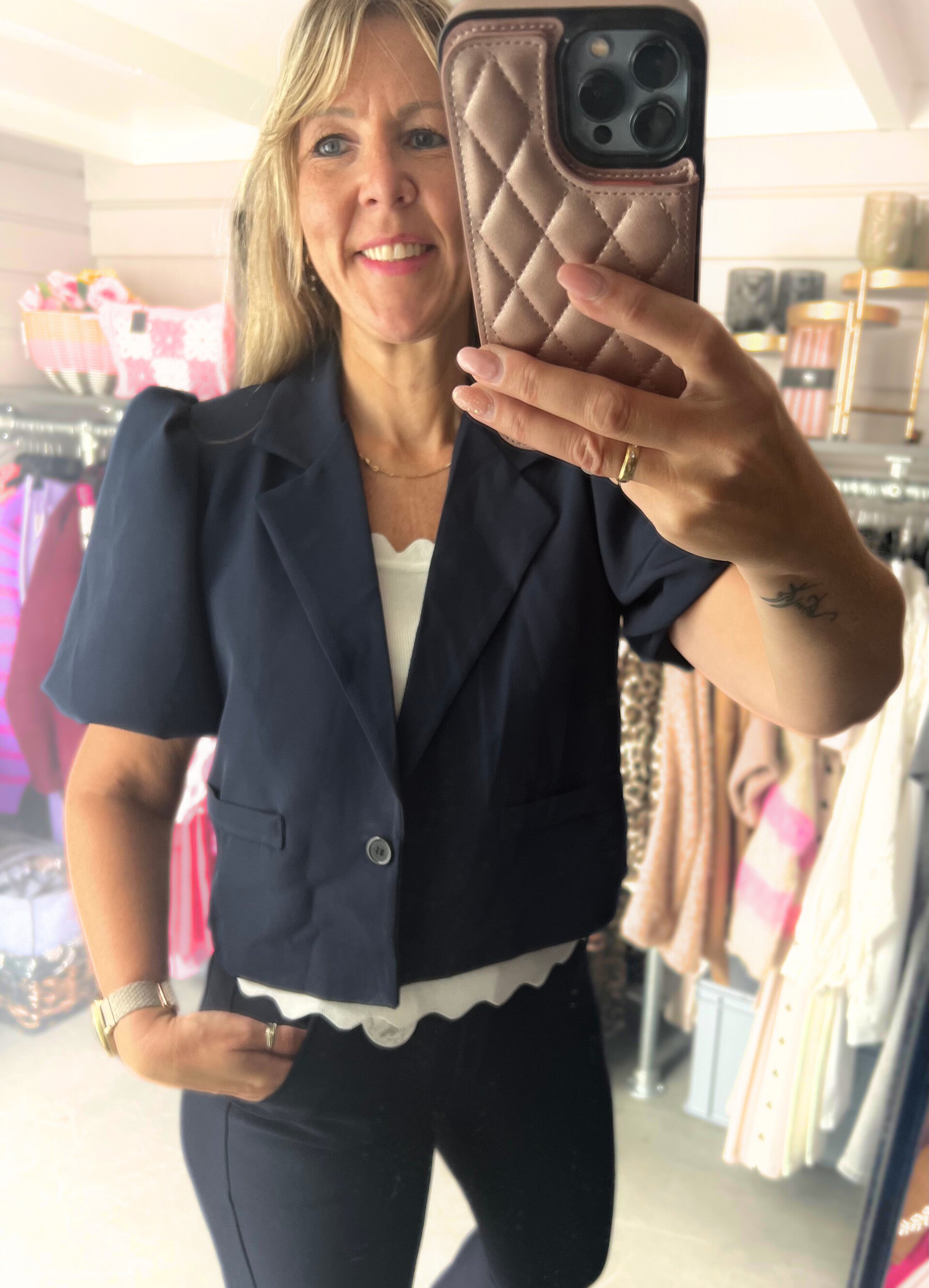 De blazer sluit met een knoop en de mouw is gepoft ingezet.