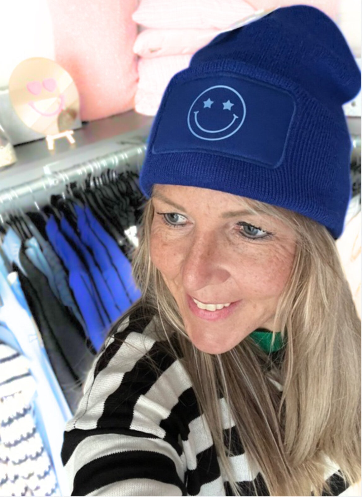 De muts is verkrijgbaar in veel verschillende kleuren met verschillende kleuren smileys.