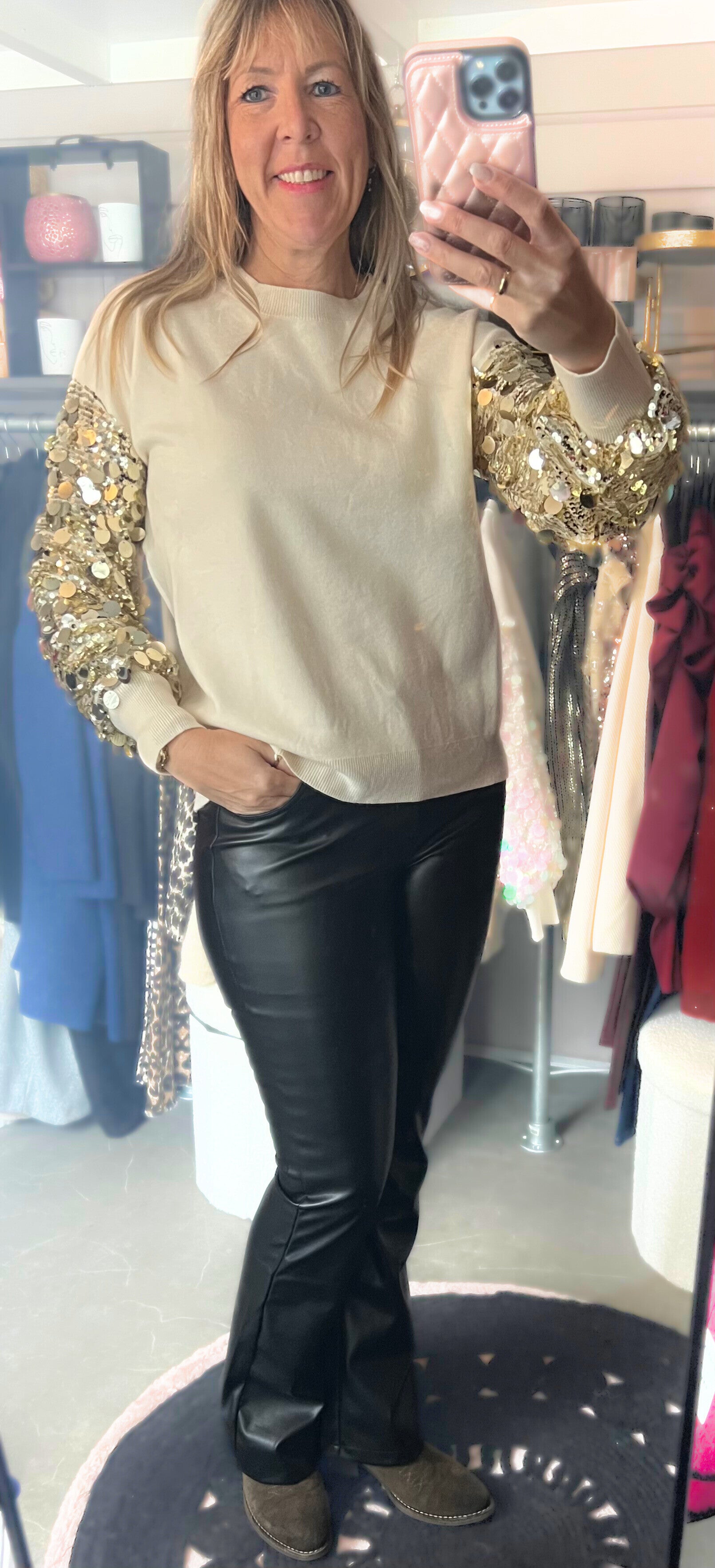 Deze trui met pailletten op de armen is de perfecte mix van chic en comfortabel. Draag hem casual op een jeans of met een feestje op een gave leren broek. Voeg een vleugje glamour toe aan je outfit.