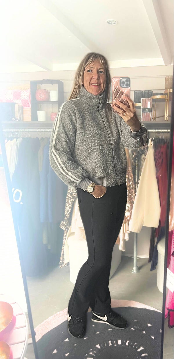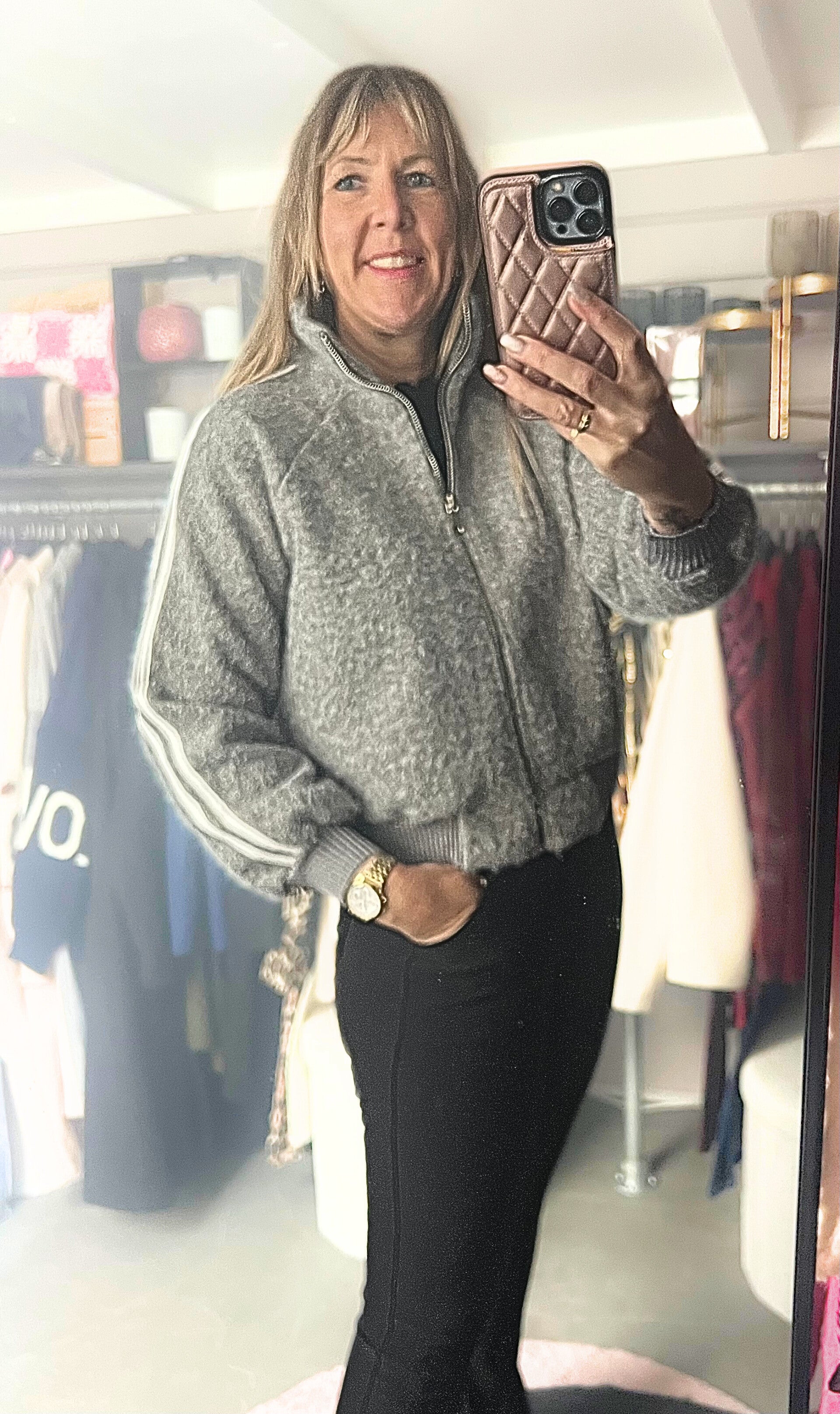 Hoe leuk is deze "sporty" fluffy bomber jack!? Het jack heeft een leuke uitstraling en witte strepen op de mouwen. Ziet er wollig uit maar kriebelt niet ;)