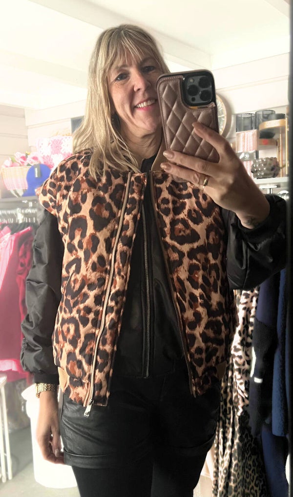 De kleur en print zijn precies goed!! Deze gilet sluit mooi aan door de elastische band.