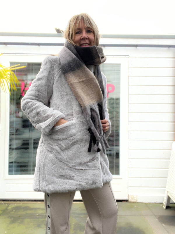 Maak je winterlook compleet met deze wintersjaal met mooie grijze tinten. Deze grote, warme en trendy wintersjaal is super leuk voor de koude dagen, met een stijlvolle uitstraling die bij elke outfit past.