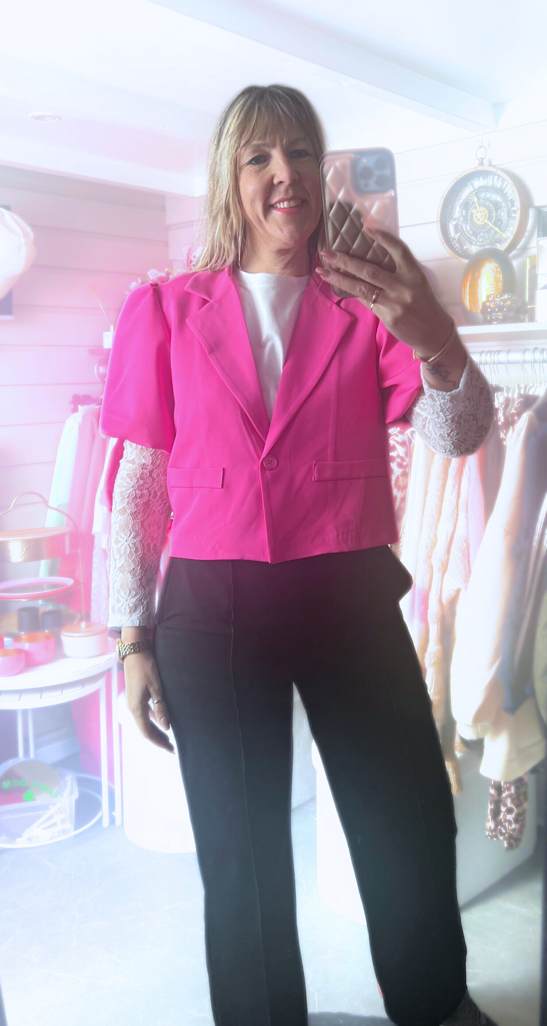 De blazer sluit met een knoop en de mouw is gepoft ingezet.