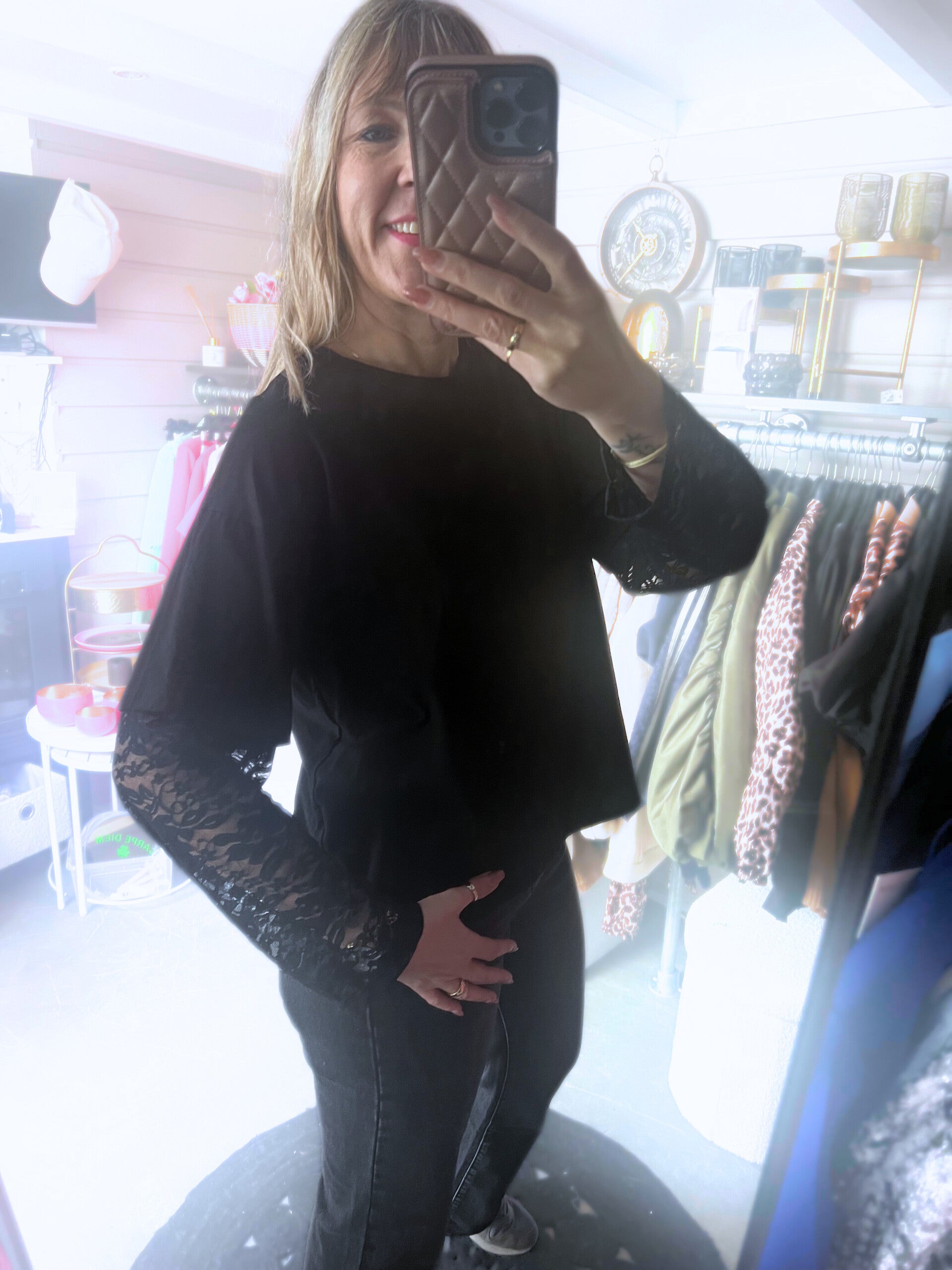 Helemaal trendy dit T-shirt met kanten mouwen!
