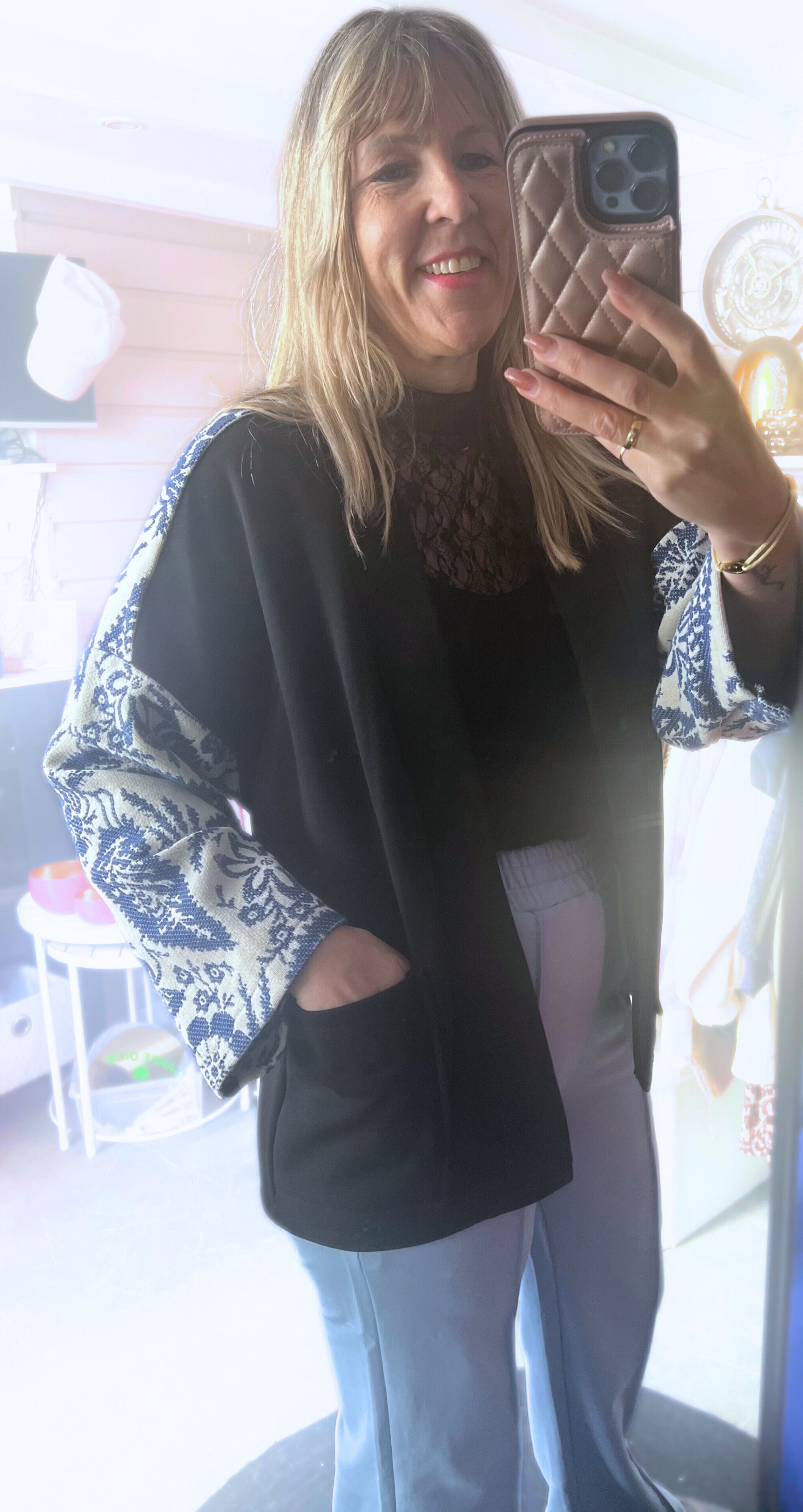 Valt liets oversized. Het vest is zwart en heeft ecru/navy geprinte mouwen. Heeft 2 zakjes en geen knopen