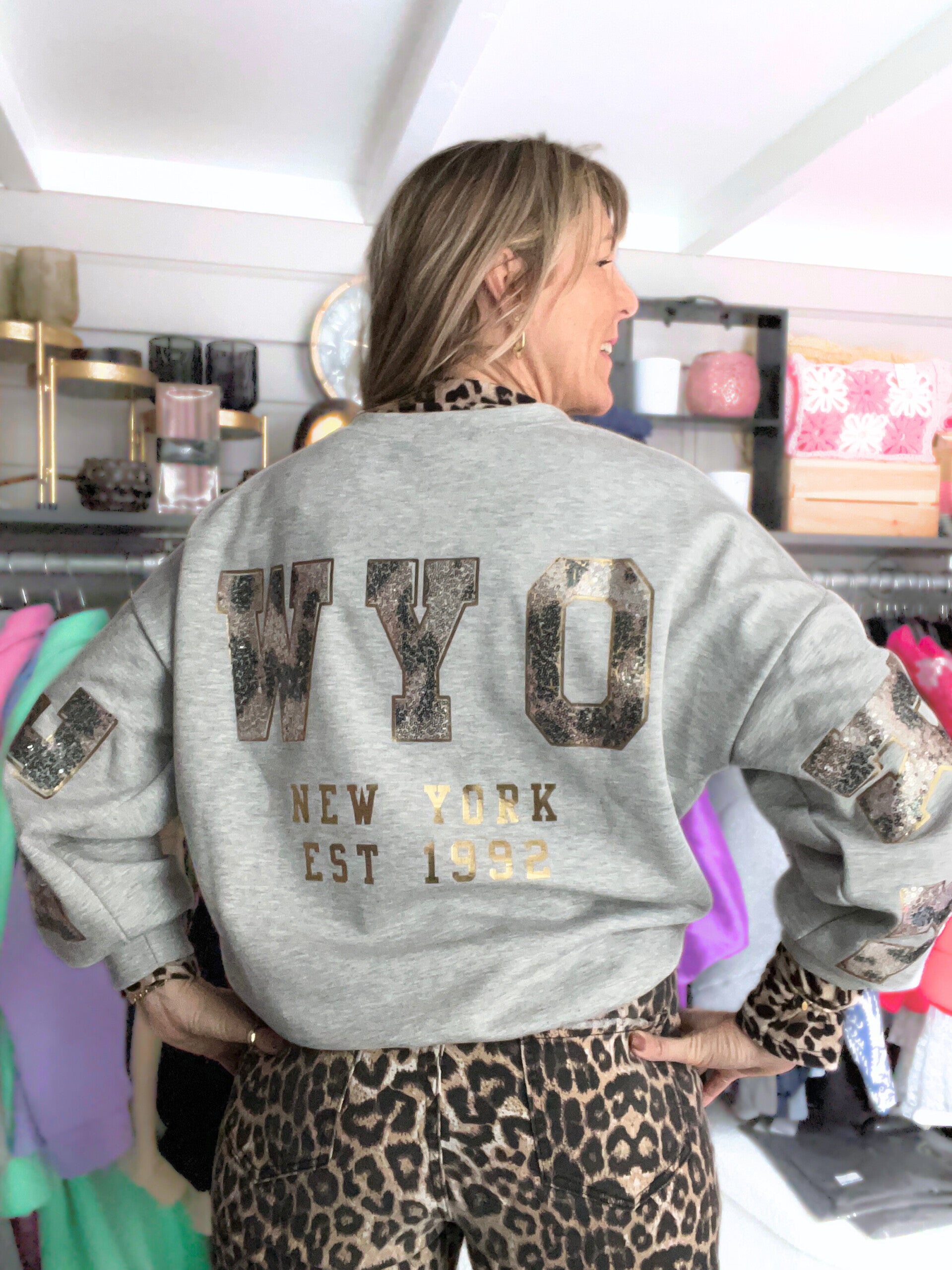 Stijlvolle trui met tekst (New York) en pailletten op de achterzijde en op de mouw. Super leuk te combineren met een panter jeans en draag er een panter top onder voor een extra leuk stylevol accent.