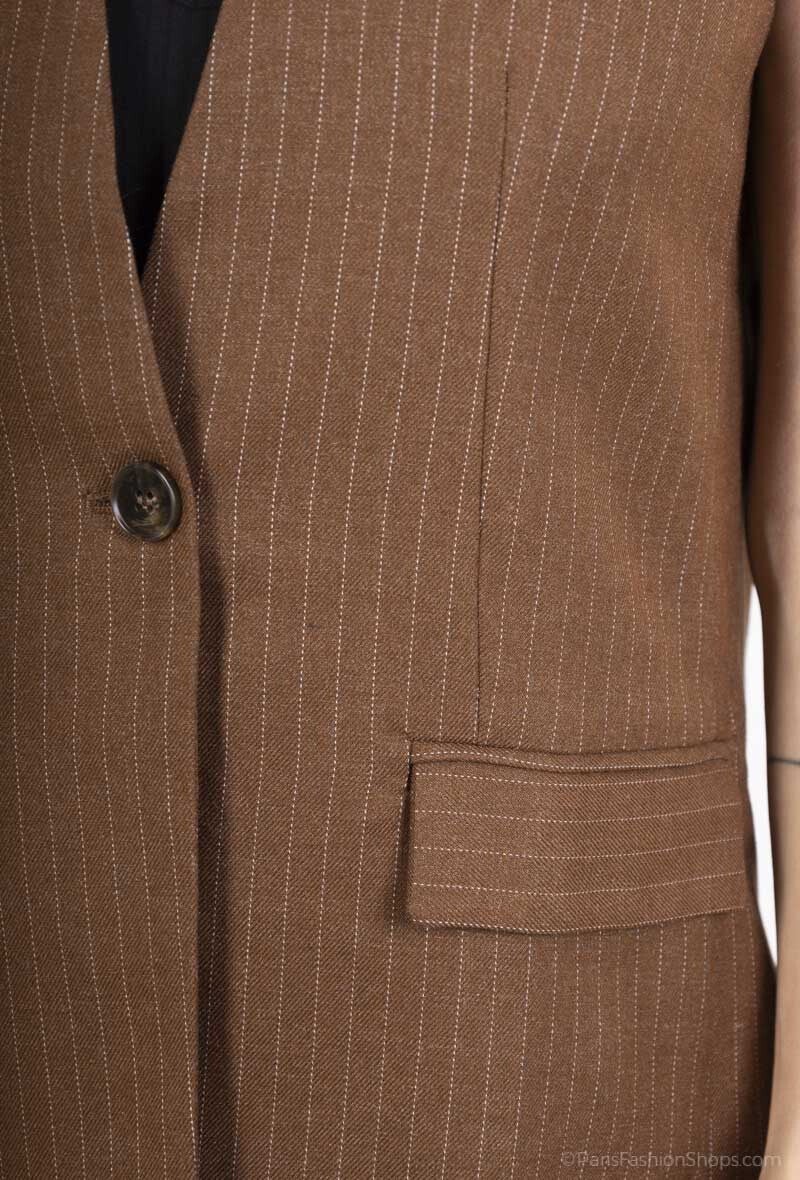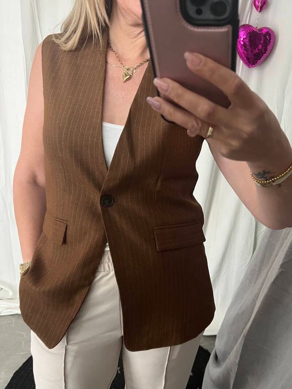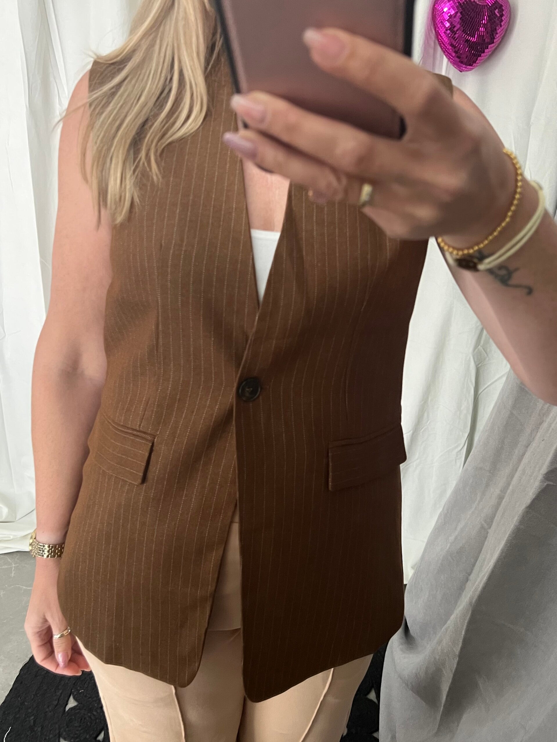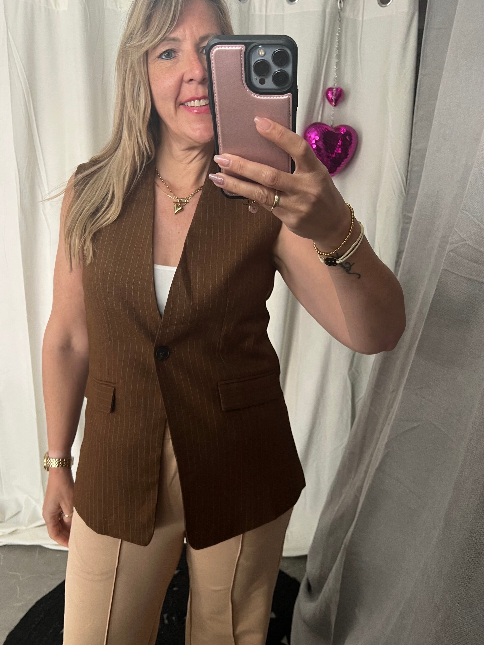 Deze gilet is voorzien van een v-hals, 1 knoop en een mooie stof met krijtstreepje. Het item heeft een aansluitende pasvorm met stretch waardoor deze comfortabel te dragen is.