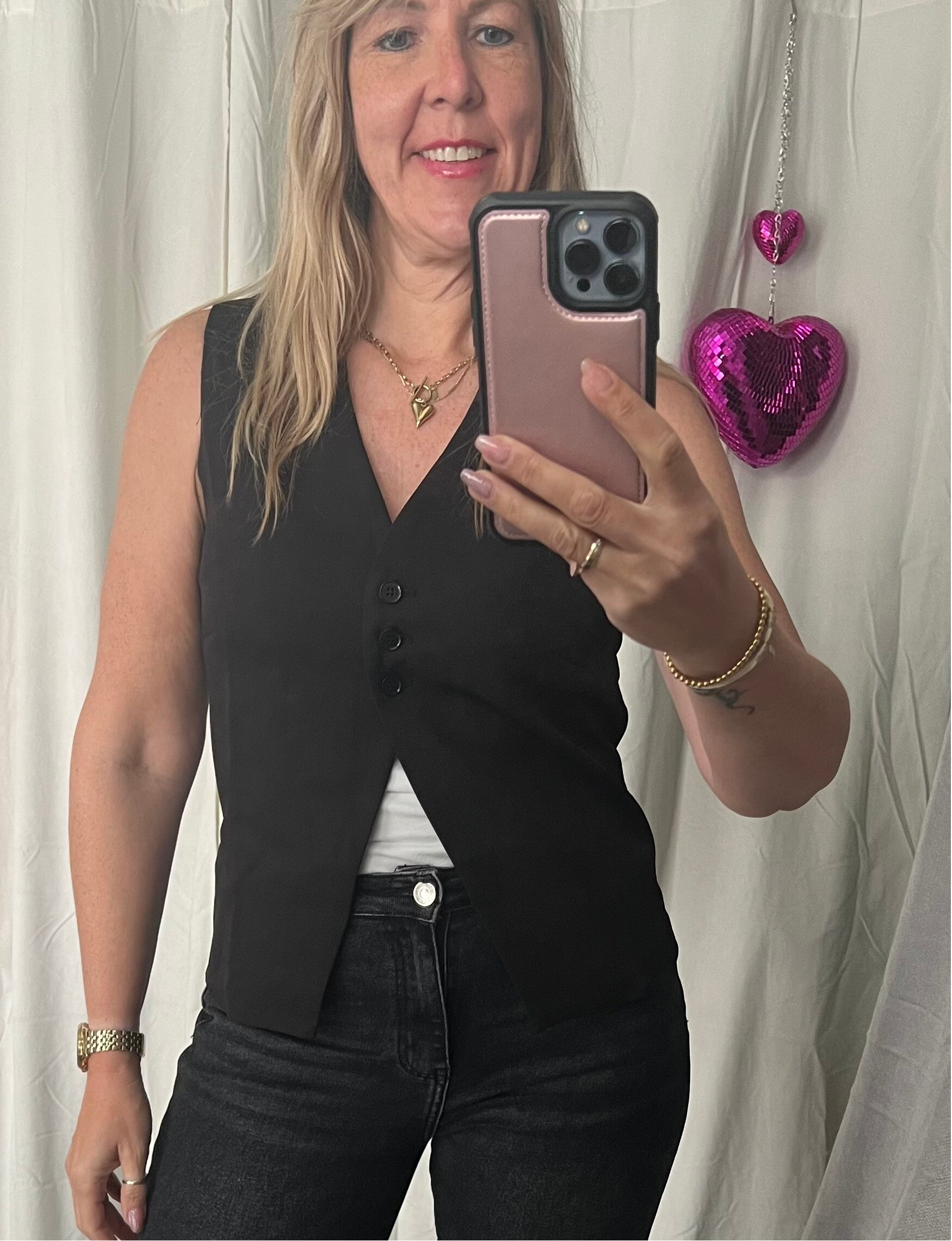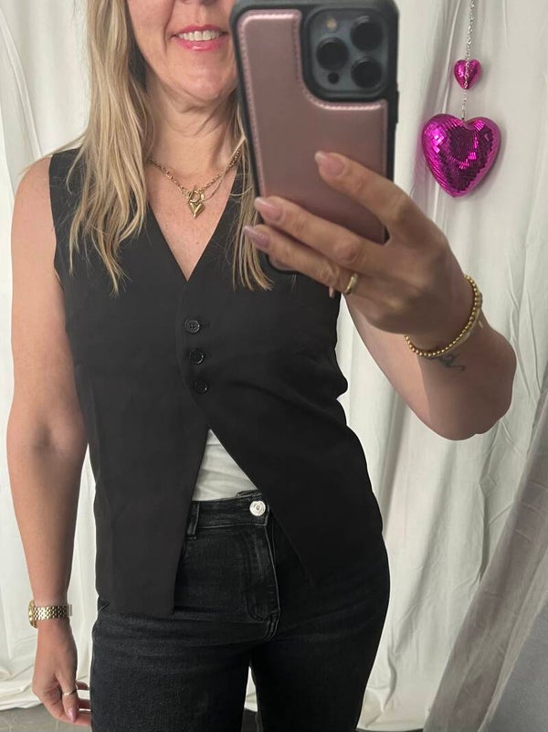Deze gilet is voorzien van een v-hals, 3 knopen en een mooie elegante stof. Het item heeft een aansluitende pasvorm met stretch waardoor deze comfortabel te dragen is.