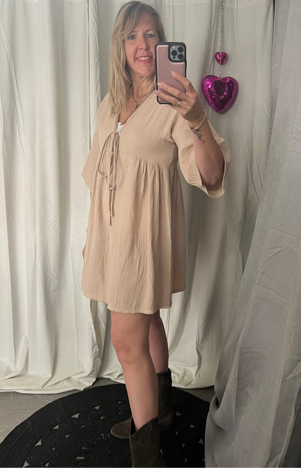 Het is een korte mini jurk met leuke wijde boho-mouwen.