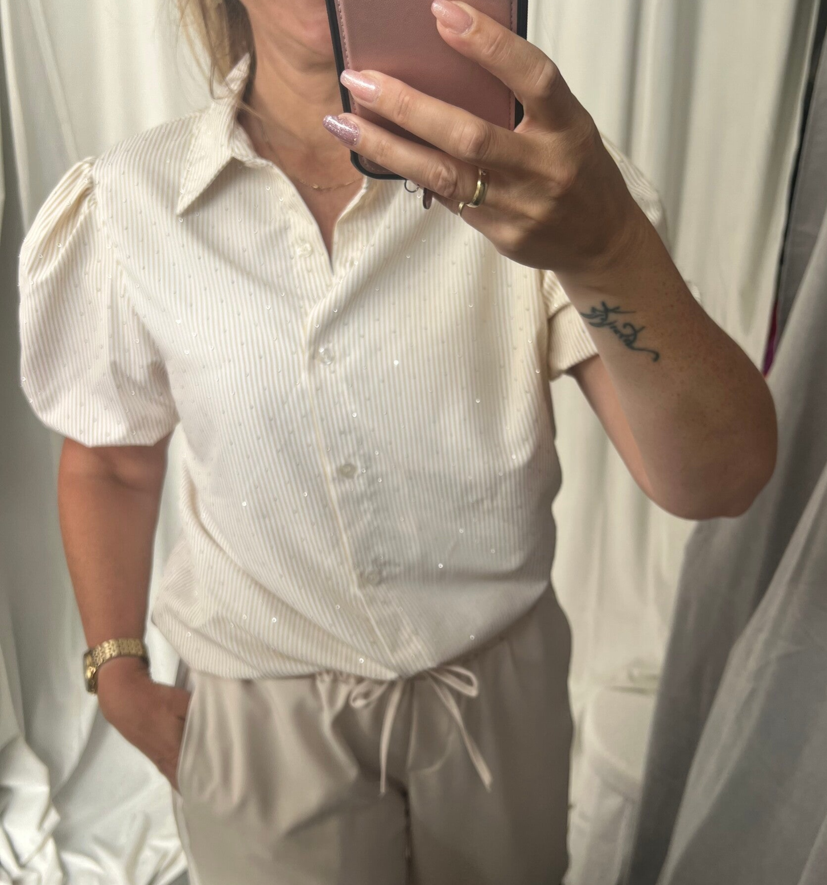 Trendy blouse met blauw-witte strepen, strassdetails en stijlvolle pofmouwen. De perfecte mix van casual en chic. Draag ‘m op jeans of rok voor een elegante, vrouwelijke look.
