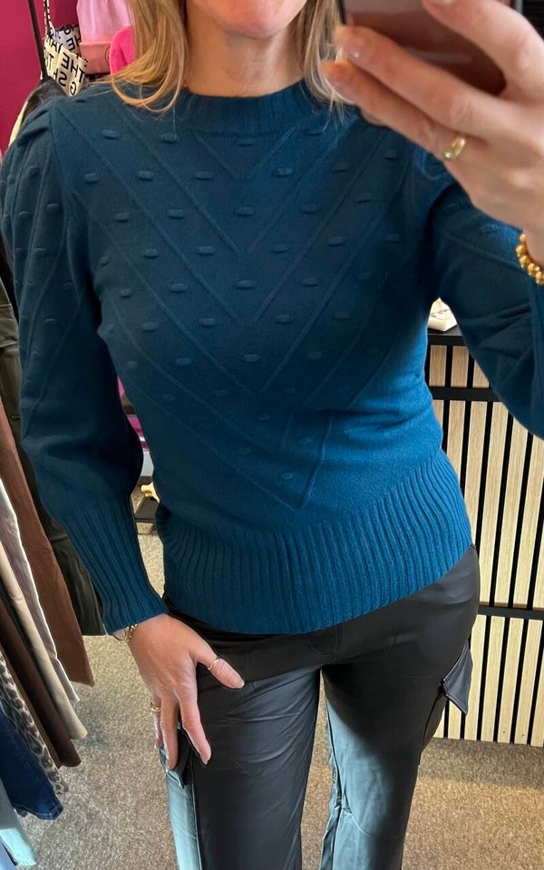 Het speelse V-motief en de subtiele bolletjes op de voorkant en mouwen geven het truitje een unieke, vrouwelijke uitstraling.