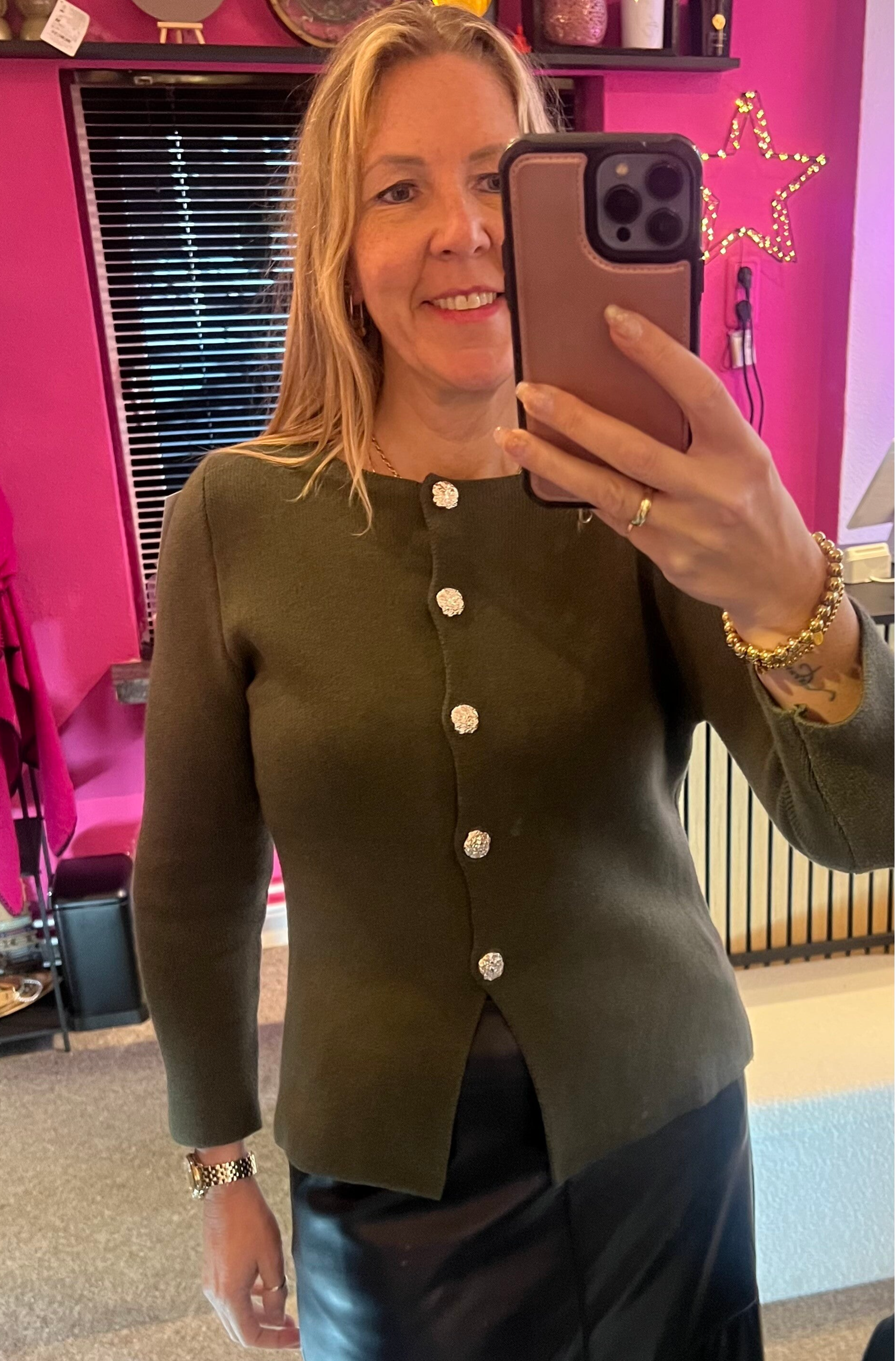 Dit vest is gemaakt van een zachte, gebreide dikke stof en afgewerkt met gouden knopen.