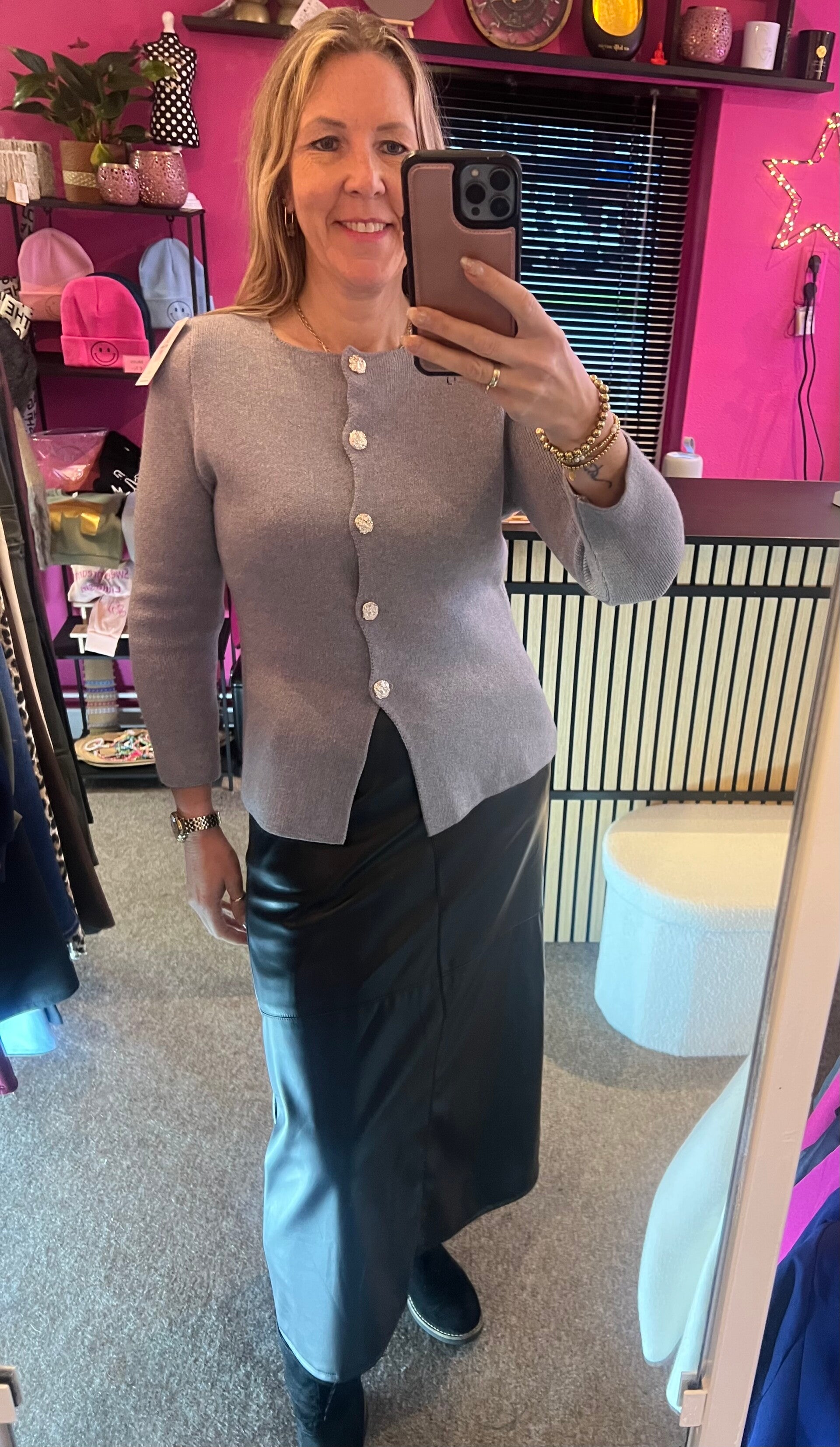 Dit vest is gemaakt van een zachte, gebreide dikke stof en afgewerkt met gouden knopen.