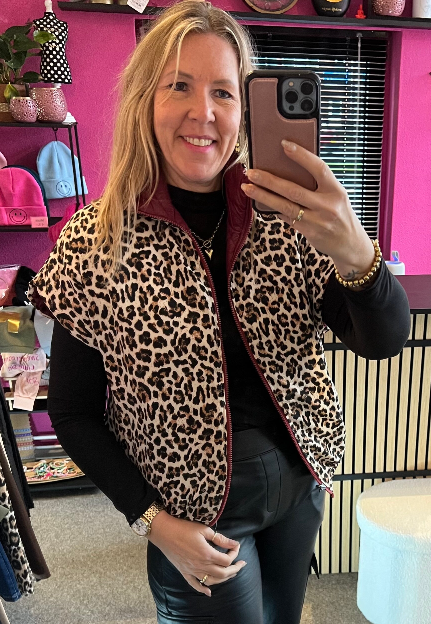 Geef je outfit een boost met onze reversible body warmer Leo in een opvallende fuchsia kleur. Dit gewatteerde vest is aan beide zijden draagbaar: de ene zijde in een mooie effen kleur en de andere zijde met een trendy leopard print. Deze bodywarmer is perfect om te combineren over een trui of longsleeve.