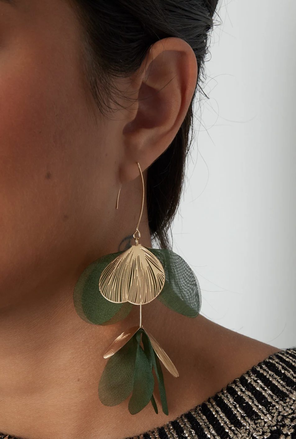 De zachte textuur van de stof in combinatie met de glanzende gouden accenten maakt deze oorbellen tot een opvallend accessoire.