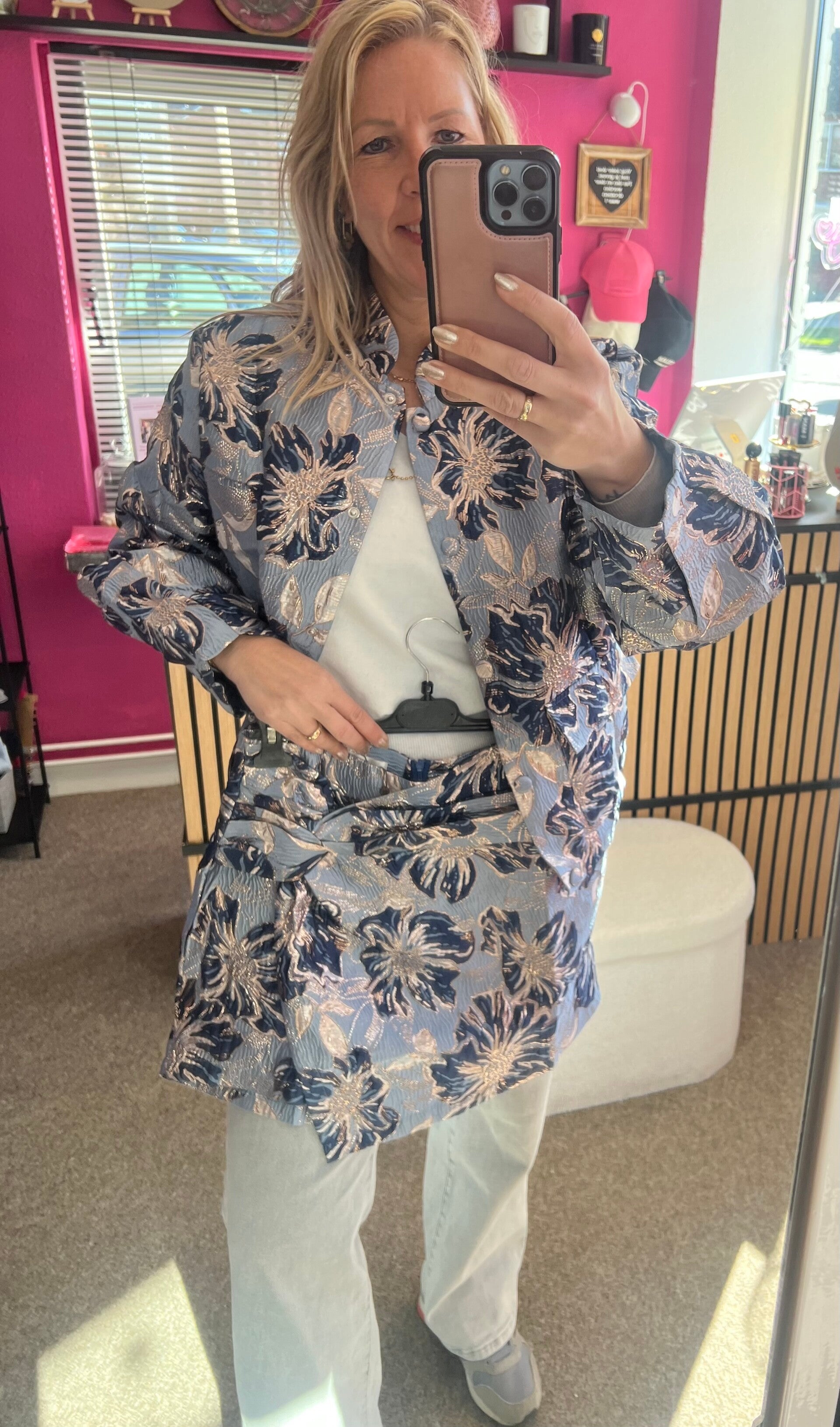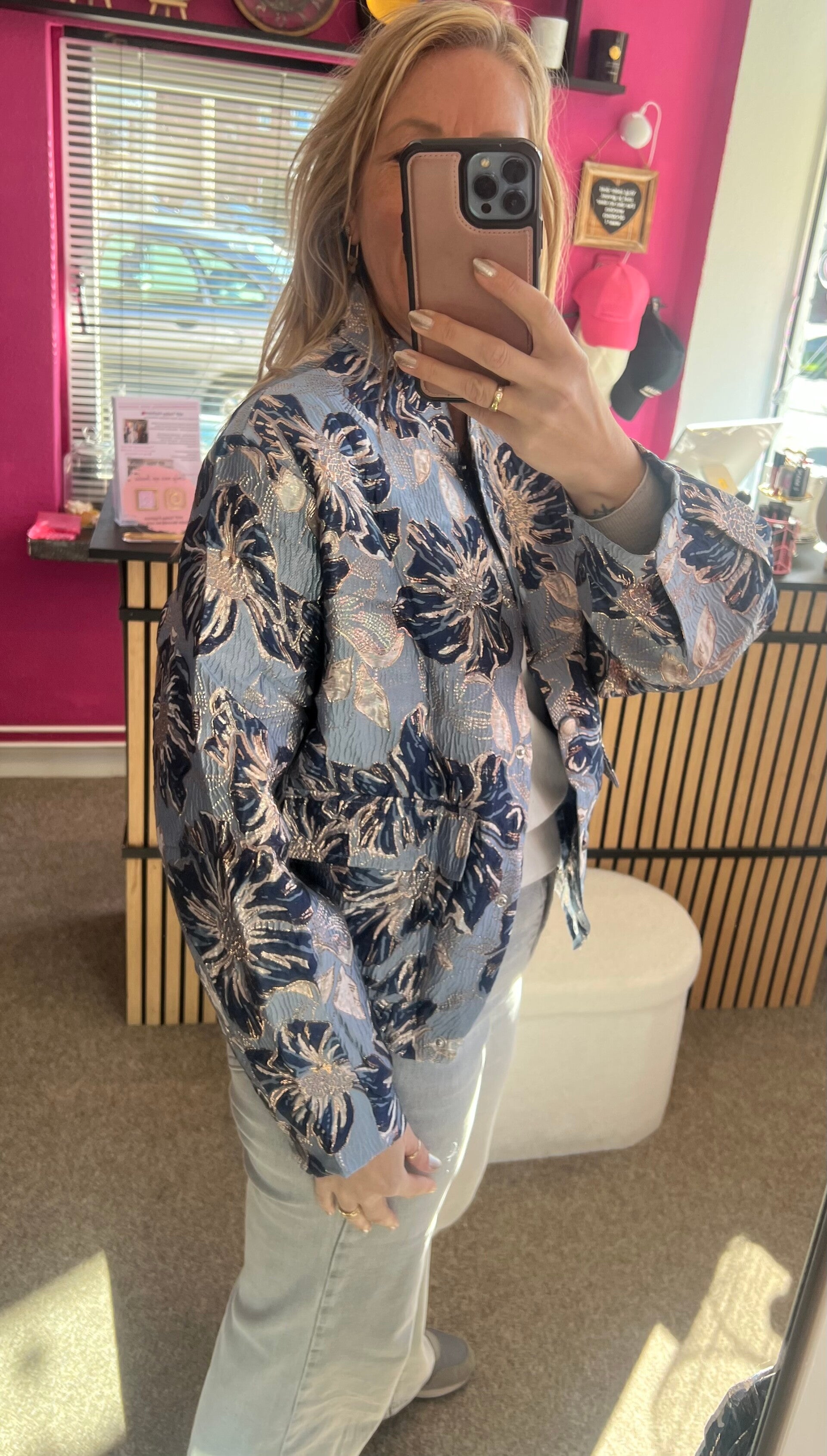 Deze jacquard bomber in het blauw heeft alles: een unieke bloemen print, subtiele glitter details en comfy pasvorm. De drukknoopsluiting maakt ‘m makkelijk te dragen, open voor casual cool of dicht voor extra flair.