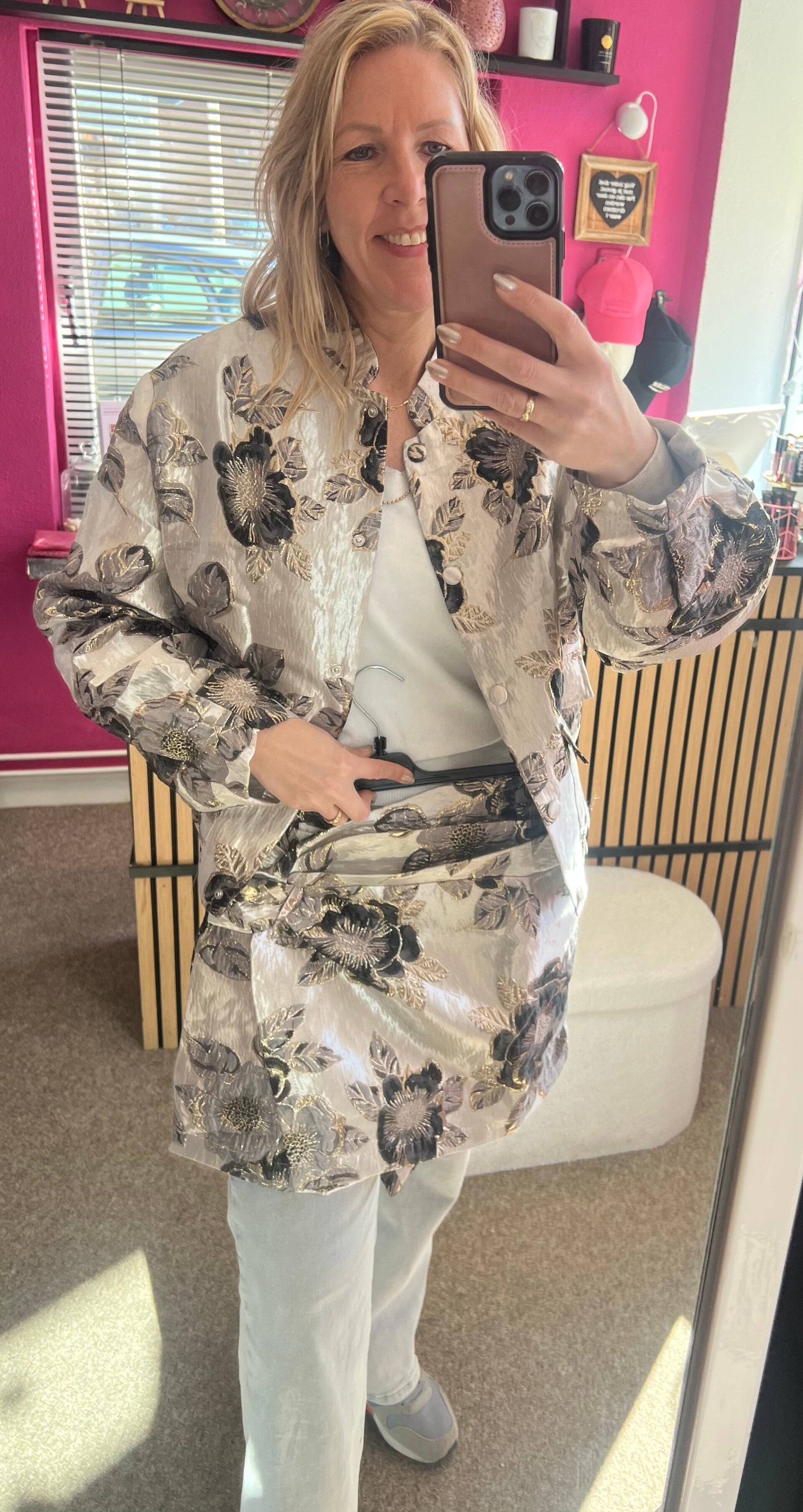 Deze jacquard bomber in het grijs heeft alles: een unieke bloemen print, subtiele glitter details en comfy pasvorm. De drukknoopsluiting maakt ‘m makkelijk te dragen, open voor casual cool of dicht voor extra flair.