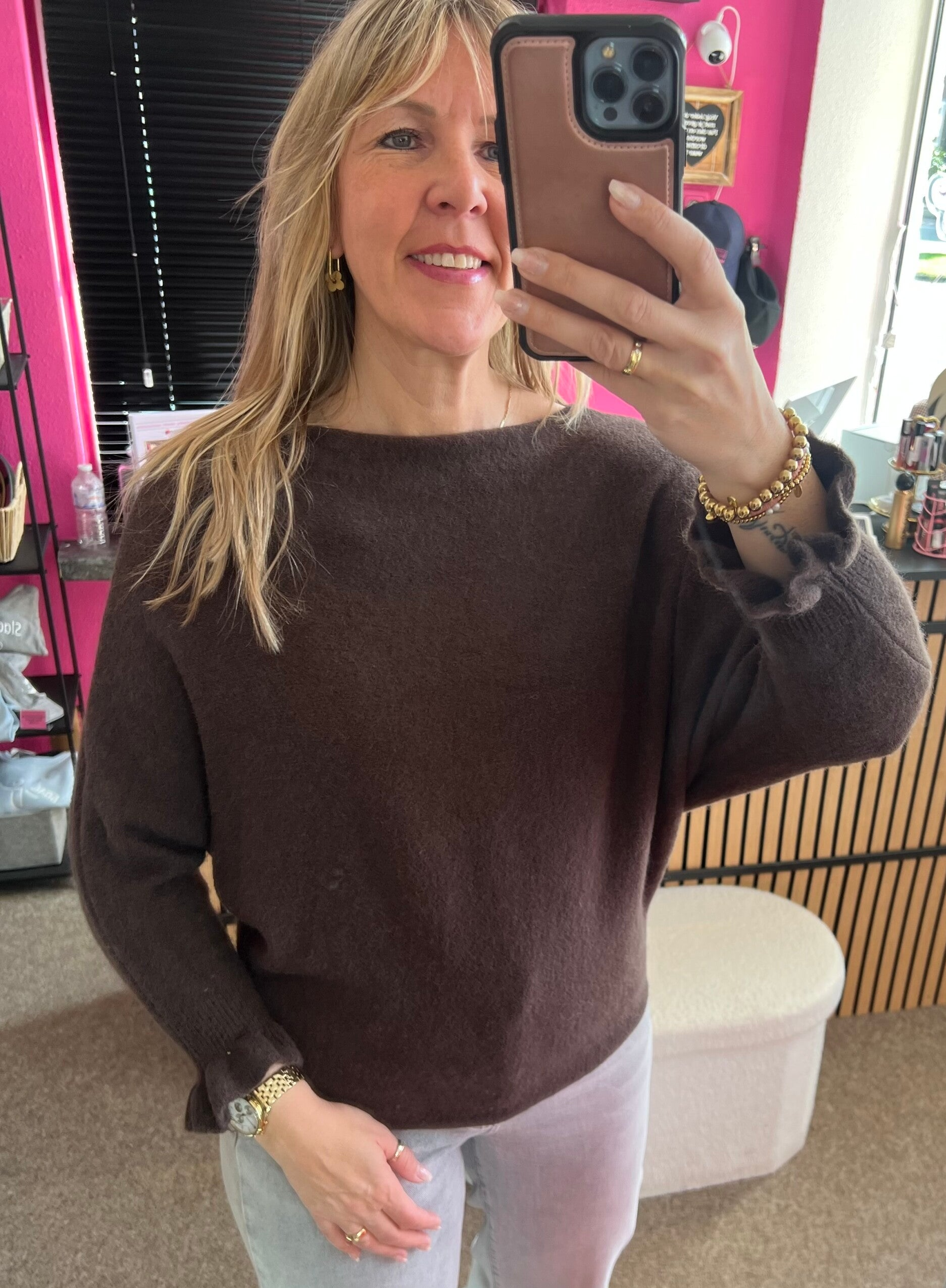 Trui boothals, vleermuis mouw met ruffle Bruin