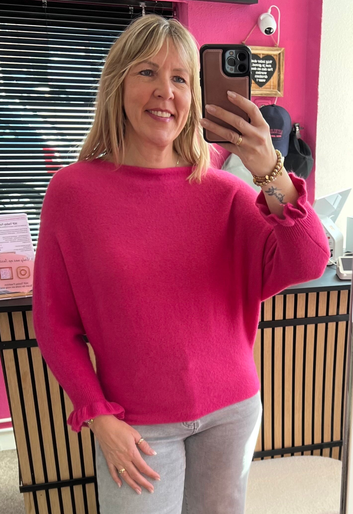 Trui boothals, vleermuis mouw met ruffle Fuchsia