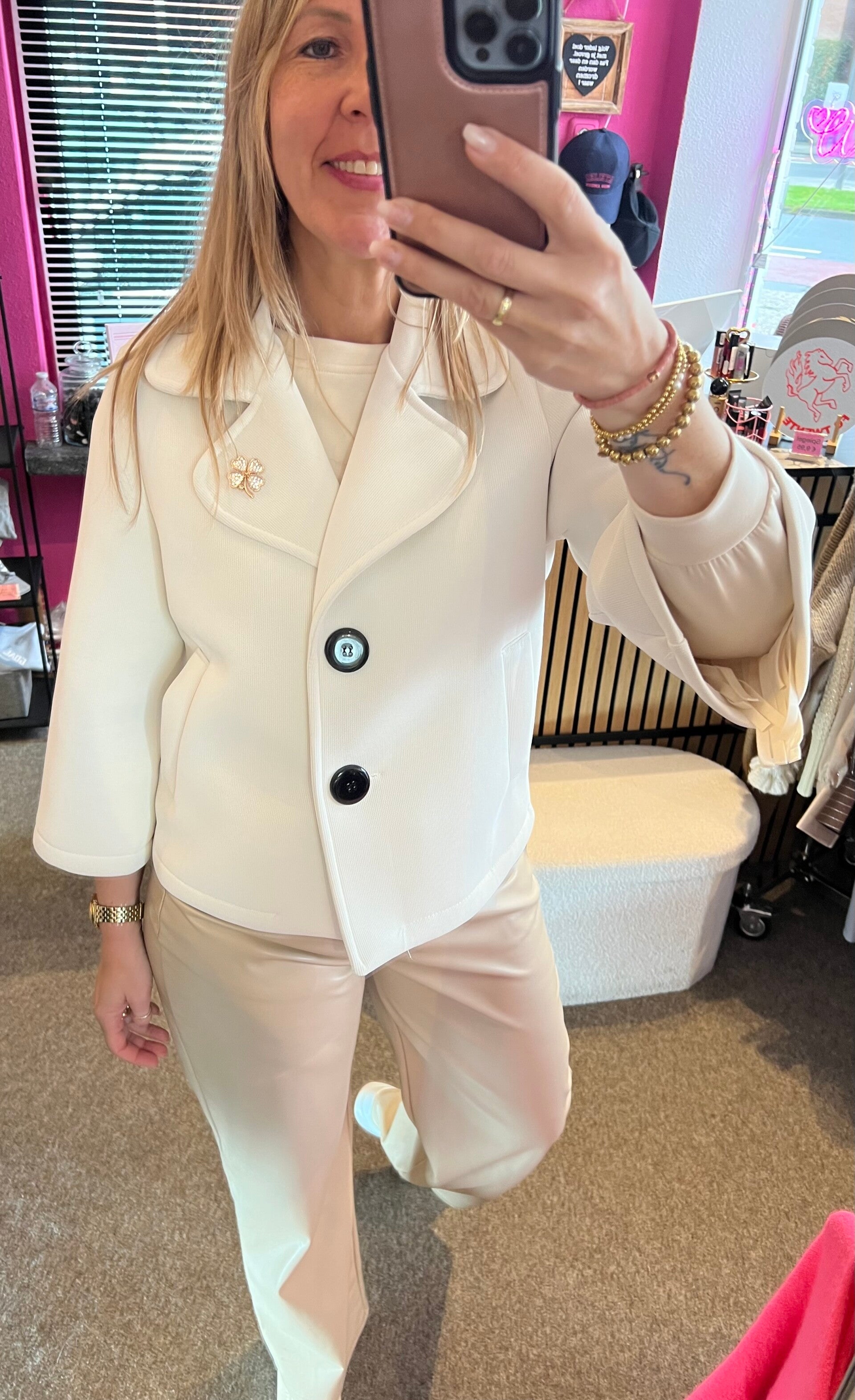 Scuba jasje met broche Creme